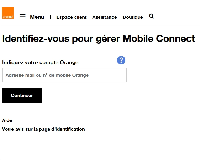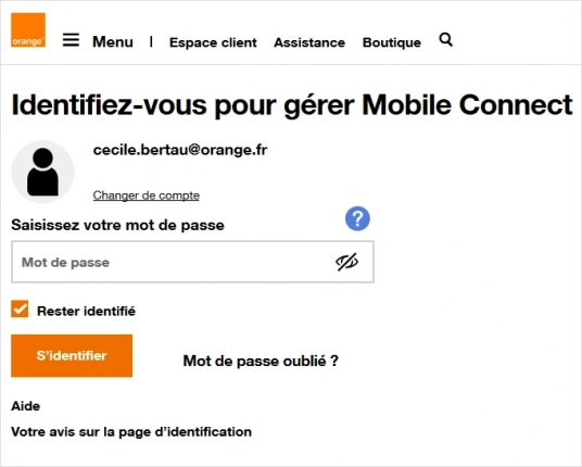 si vous êtes déjà identifié : assurez-vous d'être connecté au compte Orange pour lequel vous souhaitez activer Mobile Connect et passez directement à l'étape 4.- Saisissez votre adresse mail ou votre numéro de mobile.