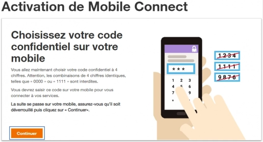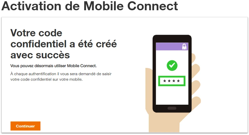 Cliquez sur Continuer pour activer Mobile Connect sur votre compte Orange.