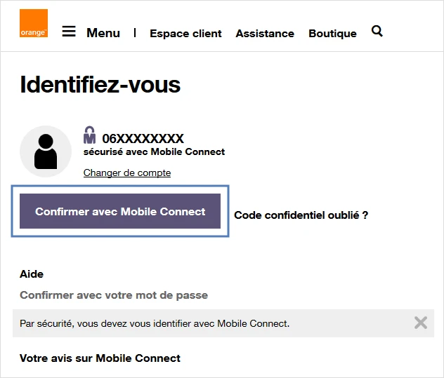 ATTENTION : Le service Mobile Connect va s’arrêter progressivement à partir du mois d’août 2026. A ce moment-là, pour vous identifier lors d'une nouvelle connexion, vous devrez saisir vos identifiant et mot de passe et pourrez choisir notre nouveau dispositif d'authentification renforcée basée sur l’application Orange et moi et votre mobile.