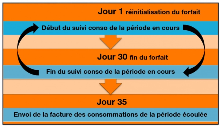 La période de suivi varie entre 28 et 31 jours en fonction des mois. Votre facture est émise 5 jours après la réinitialisation de votre offre.