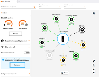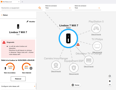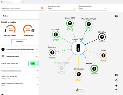 VérifierUne croix rouge à côté de votre Livebox vous indique que le wifi est désactivé. Si vous souhaitez réactiver le wifi, rendez-vous dans la rubrique : Gérer votre wifi > Activer votre réseau wifi > Cliquez sur le bouton gris « Non ». |