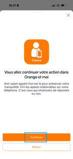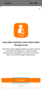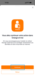 Appuyez sur Continuer. Si l'application Orange et moi n'est pas installée, vous êtes redirigé vers le App Store. Procédez à l'installation. |