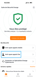 Pour activer la protection contre les appels indésirables sur votre téléphone fixe, appuyez sur Anti-spam appels fixe (pour les détenteurs d’une offre Orange Internet) |
