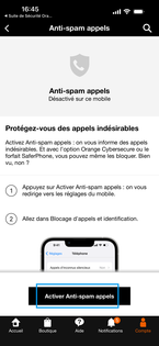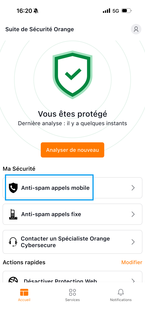 Pour activer l'Anti-Spam appels mobile, cliquez sur l'application Suite de Sécurité Orange sur votre mobile puis une fois dans l'application, sélectionnez Anti-Spam appels mobile. |