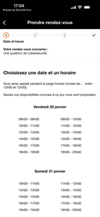 Choisissez une date et un horaire puis poursuivez les étapes pour confirmer le rendez-vous |