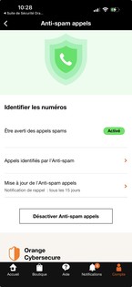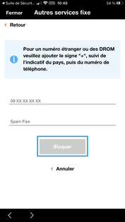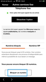 Par défaut, l’anti-spam appels fixe est activé, si vous le désactivez, vous pourrez le réactiver depuis l’espace client https://espace-client.orange.fr/equipements/9113807834/54001/stop-secret Vous pouvez bloquer des numéros en appuyant sur Bloquer un numéroDans la partie Numéros bloqués, appuyez sur Bloquer un numéro. |