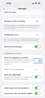 Descendez dans le menu puis activez la fonction Filtrer les expéditeurs inconnus. |
