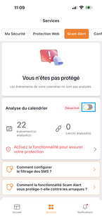 Choisissez l'onglet Scam Alert. Scam alert vous avertit lorsque vous recevez des liens malveillants par SMS, application de messagerie instantanée ou application mail. |