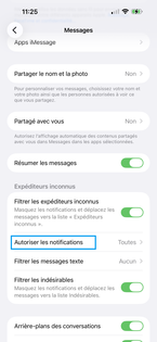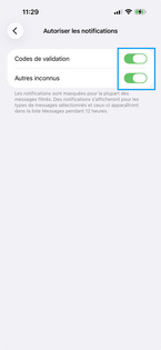 Par défaut les notifications sont masquées pour les Codes de validation et les Autres inconnus. Pour afficher la notification, faites glisser le(s) curseur(s) vers la gauche. Si celle-ci sont déjà désactivées, pour afficher les notifications, faites glisser le(s) curseur(s) vers la droite. Revenez sur l'écran précédent. |