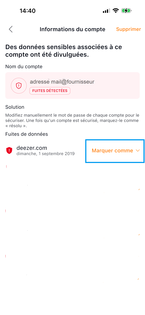 Si une fuite est détectée après l’analyse de l’e-mail, il faut se rendre sur le site en question (dans notre exemple Deezer.com) et changer le mot de passe. Quand cela est fait, cliquez sur le site concerné. |