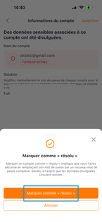 Appuyez sur Marquer comme "résolu". Reproduire l'opération si plusieurs de vos comptes à des services sont impactés. |