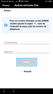 Saisissez les coordonnées du téléphone fixe (numéro et intitulé) puis cliquez sur Valider. |