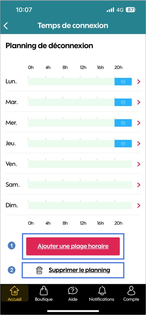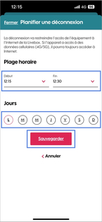 Choisir une plage horaireDéfinissez vos jours et horaires de déconnexion wifi puis cliquez sur Sauvegarder pour valider votre planning. |