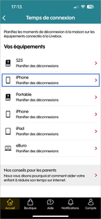 Choisir l'équipementChoisissez l'appareil sur lequel vous souhaitez activer le contrôle du temps de connexion (dans notre exemple, sélection de l'iPhone). |