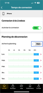 Activer ou désactiver le planningVous pouvez désactiver le planning de connexion quand vous le voulez ! Pratique si votre ado a besoin du wifi. Il suffit de glisser le bouton sur Non depuis la rubrique Votre Livebox > Paramètres wifi > Planification du Wifi > Activer le planning et hop, le wifi est de nouveau accessible. Pour le réactiver, remettez le bouton sur Oui. désactiver le planning ne l'annule pas, ça le met simplement en pause. Pour le supprimer rendez-vous rubrique Gérer le planning > Supprimer le planning. |