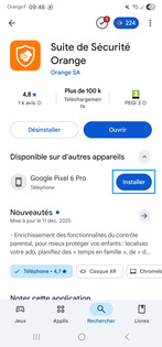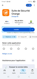 Sur votre mobile depuis le Play Store, recherchez et sélectionnez l'application Suite de Sécurité Orange. Appuyez sur Installer pour commencer le téléchargement sur votre mobile puis patientez pendant le téléchargement. |
