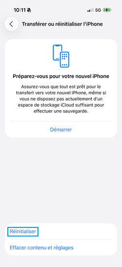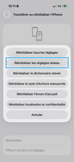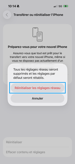 Cette manipulation réinitialisera les réglages réseau mobile et supprimera les connexions et mots de passe Wi-Fi, ainsi que les paramètres Bluetooth. Vos autres données personnelles sont conservées.
