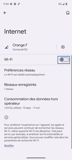 Faites glisser le curseur Wi-Fi vers la droite pour activer la fonction.