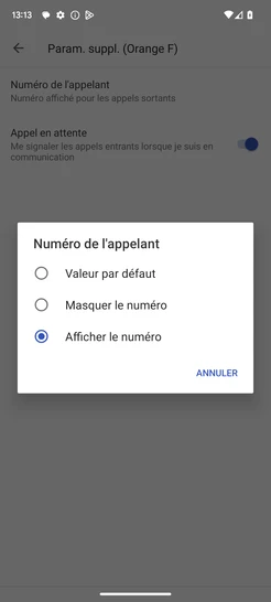 - Valeur par défaut : en fonction des services activés sur le réseau.- Masquer le numéro : votre numéro est caché pour vos interlocuteurs.- Afficher le numéro: votre numéro est visible par vos interlocuteurs.