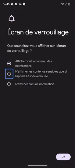 Étape 8 : Sélectionnez le contenu de l'écran de verrouillage.Dans notre exemple, choisissez la pastille correspondant à N'afficher les contenus sensibles que si l'appareil est déverrouillé.