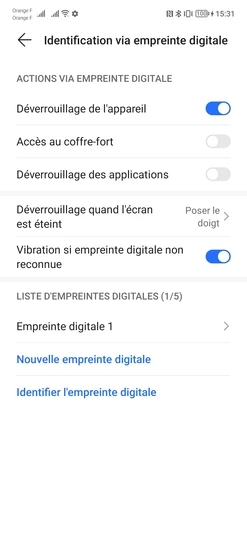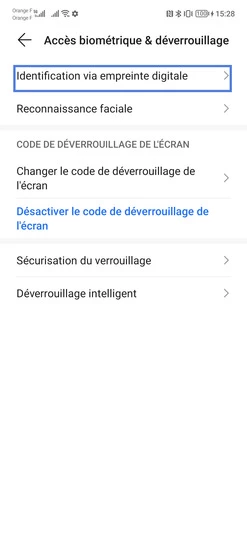 Étape 3 : Sélectionnez Identification via empreinte digitale.Lors de la première création d'empreinte digitale, veuillez définir un code de déverrouillage de l'écran et le confirmer.Remarque : ce mode secondaire vous sera demandé si l'empreinte digitale n'est pas reconnue ou bien au démarrage suite à une extinction.