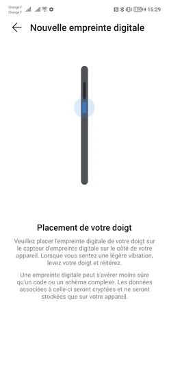 Étape 5 : Commencez l'enregistrement d'une empreinte en positionnant un doigt sur le lecteur situé sur le côté du téléphone.