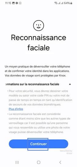 Étape 6 : Prenez connaissance des informations relatives à la Reconnaissance faciale puis allez sur Continuer.