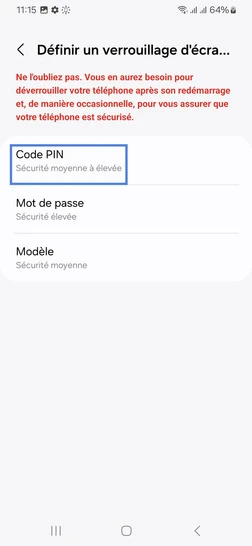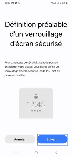 Étape 8 : Sélectionnez un mode de verrouillage secondaire. Dans notre exemple, sélectionnez Code PIN (ce code vous sera demandé si la reconnaissance faciale faciale ne fonctionne pas ou encore au démarrage après extinction du mobile).Après saisie de votre code PIN allez sur Continuer.Puis confirmez votre code PIN avec OK.Procédez ensuite à l'enregistrement de votre visage.