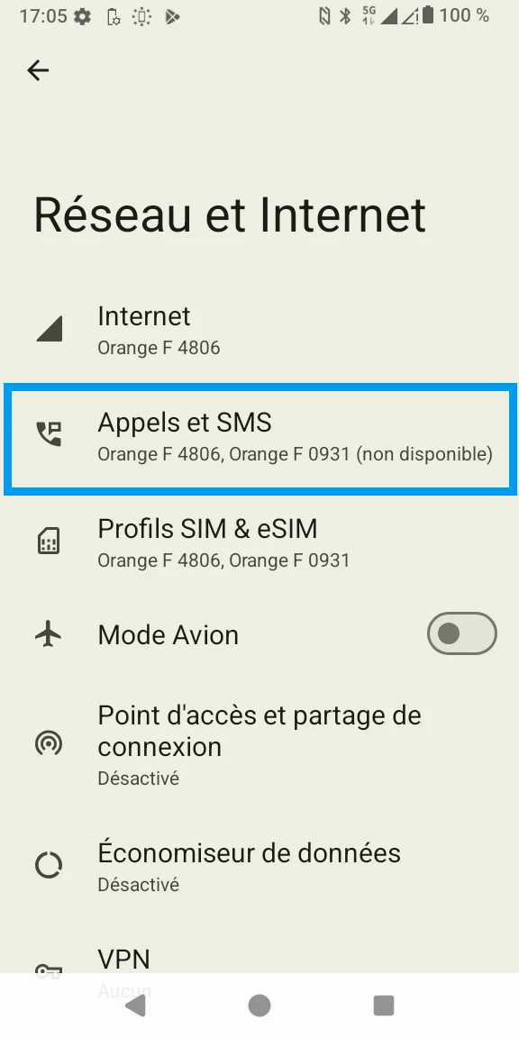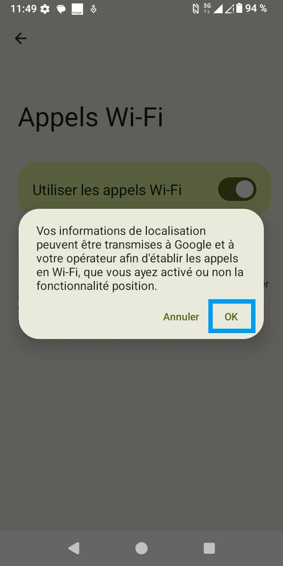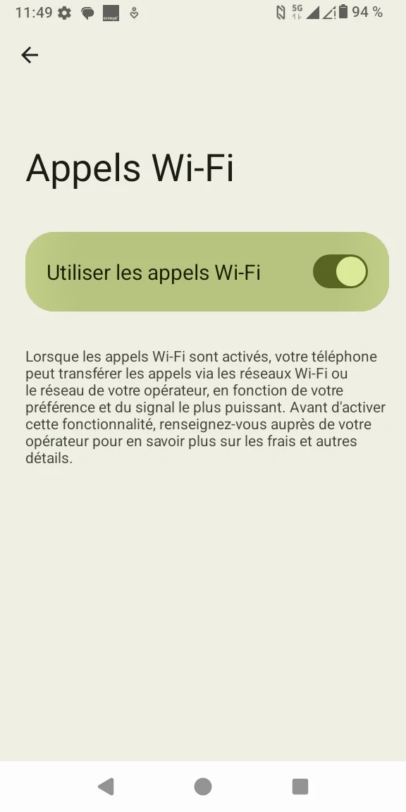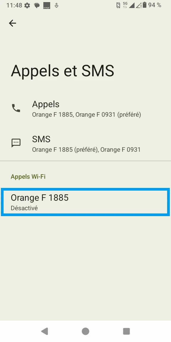 Étape 4 : Depuis la zone Appels Wi-Fi, allez sur le libellé de la carte SIM (en sous-titre, Désactivé).