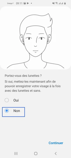 Étape 5 : Pressez Continuer après avoir lu les informations sur la Reconnaissance faciale.