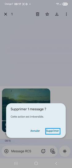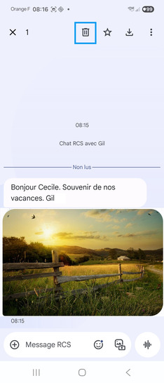 Étape 1 : Sélectionnez l'icône Messages. Étape 2 : Ouvrez le message concerné. Étape 3 : Cliquez sur la pièce jointe. Étape 4 : Appuyez sur l'icône Télécharger. Étape 5 : La pièce jointe est enregistrée. Étape 6 : Revenez sur le message en cliquant sur la croix. Étape 7 : Faites un appui long sur le message. Étape 8 : Sélectionnez l’icône Corbeille. Étape 9 : Confirmez la suppression du message en cliquant sur Supprimer. Étape 10 : Le message est supprimé.Nous sommes là pour vous assurer une gestion sereine de vos messages multimédias. Si vous avez d'autres questions ou besoin d'assistance supplémentaire, notre équipe est prête à vous guider.