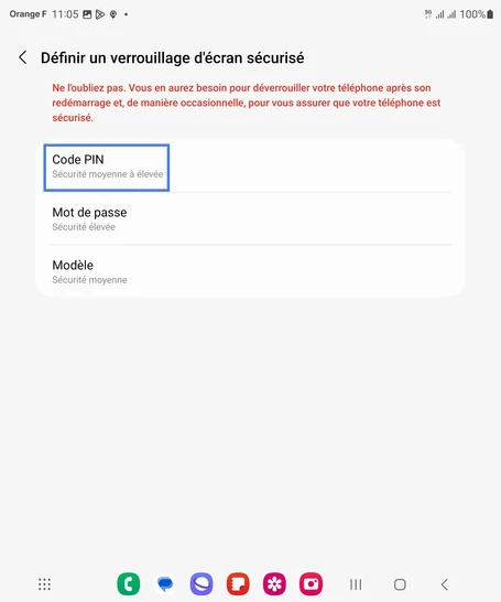 Étape 8 : Sélectionnez un modèle, dans notre exemple Code PIN. Il vous sera demandé si la reconnaissance faciale ne fonctionne pas ou encore au démarrage après extinction du mobile.Dans les écrans suivants, saisissez et confirmez votre code pin.