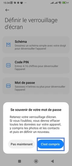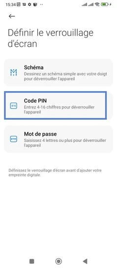 Définissez le type de verrouillage, dans notre exemple Code PIN.